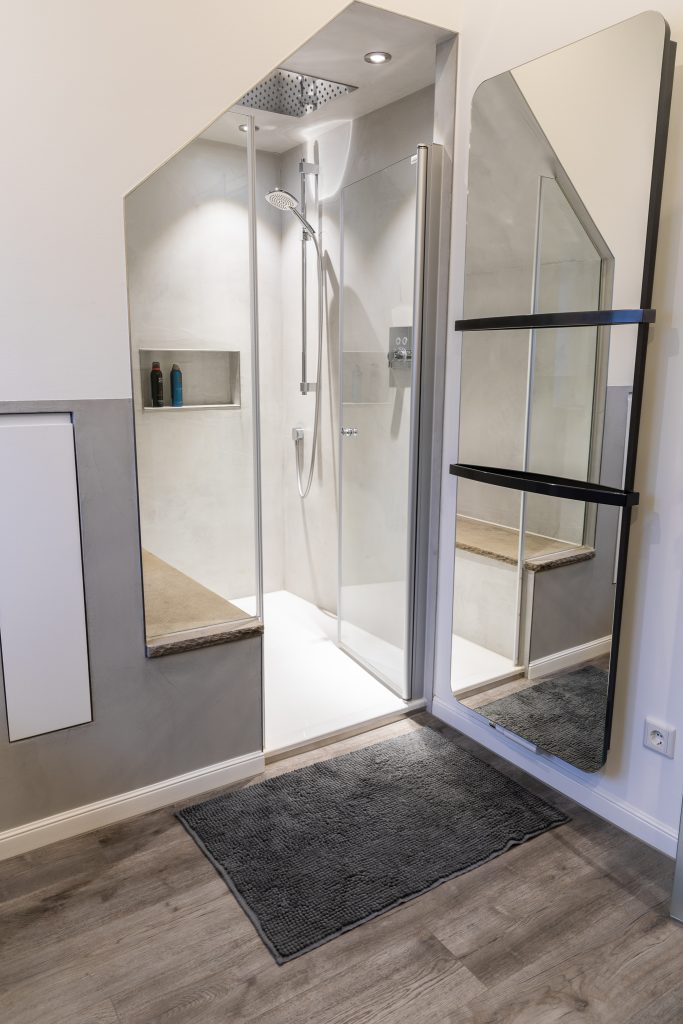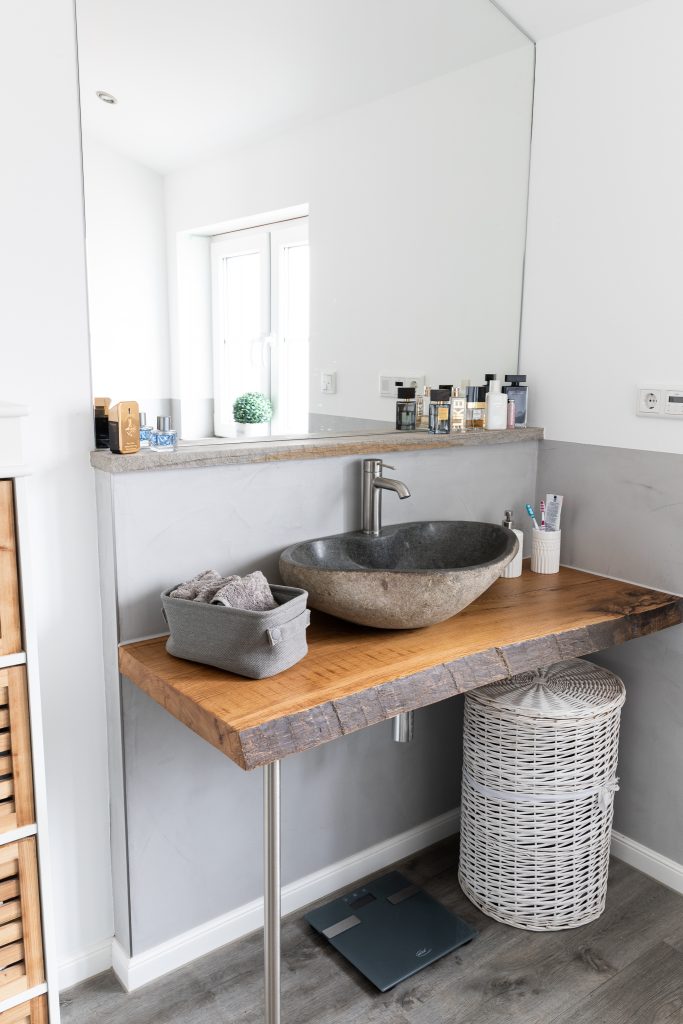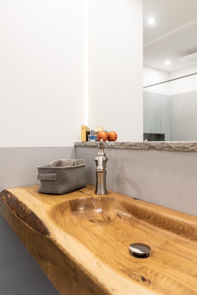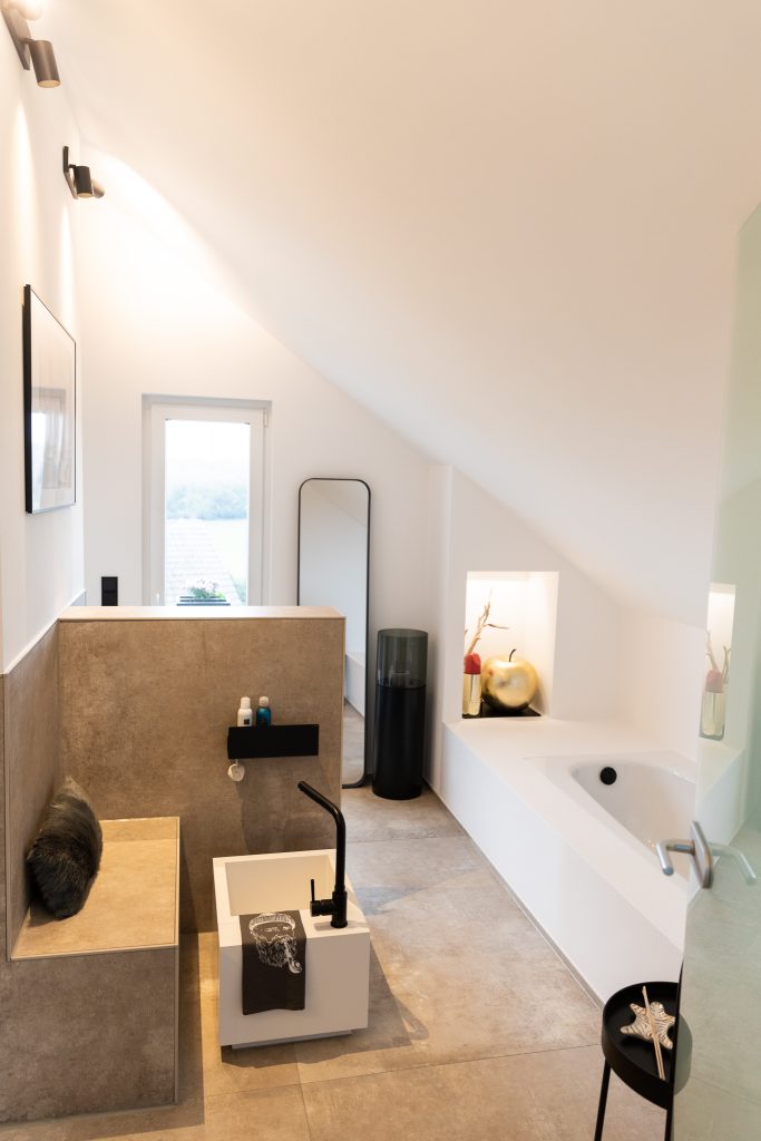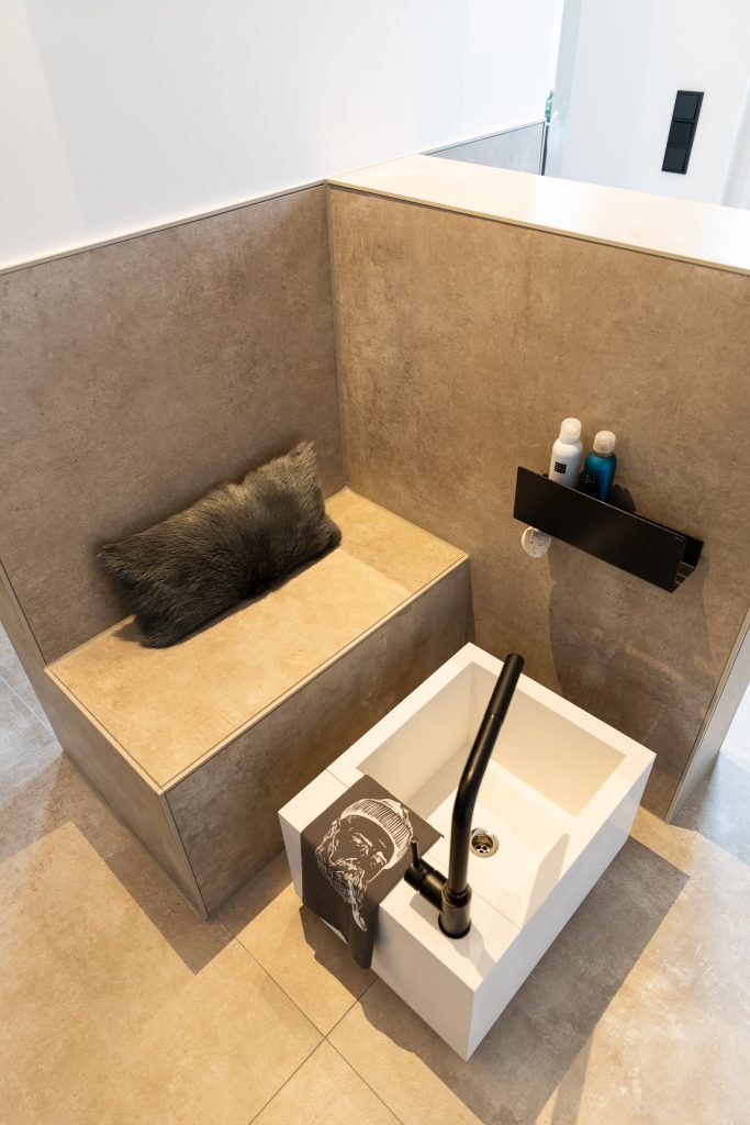 Ein fugenlos gestaltetes Bad, welches durch den unikaten Waschtisch an
