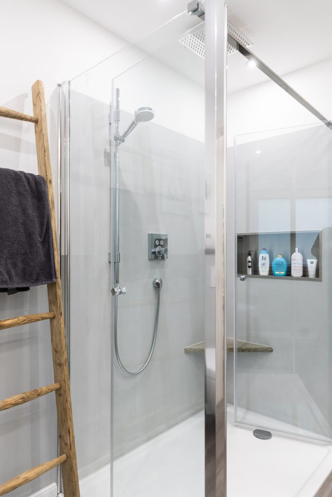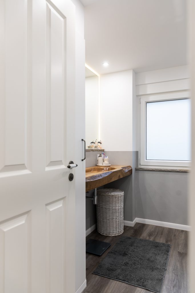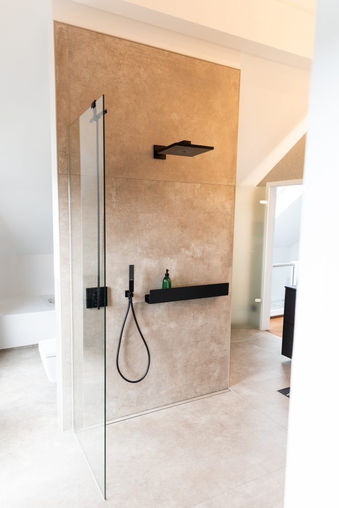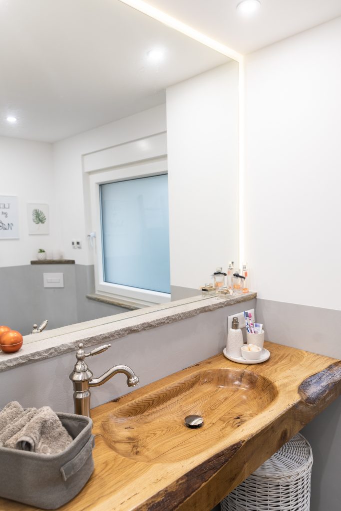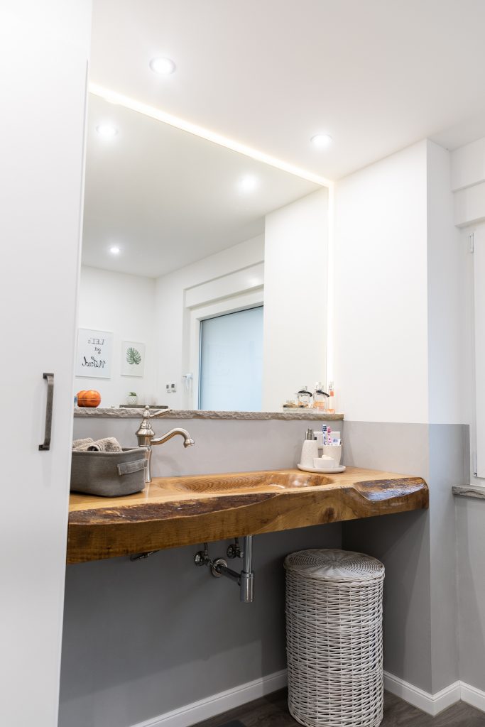 Ein fugenlos gestaltetes Bad, welches durch den unikaten Waschtisch an